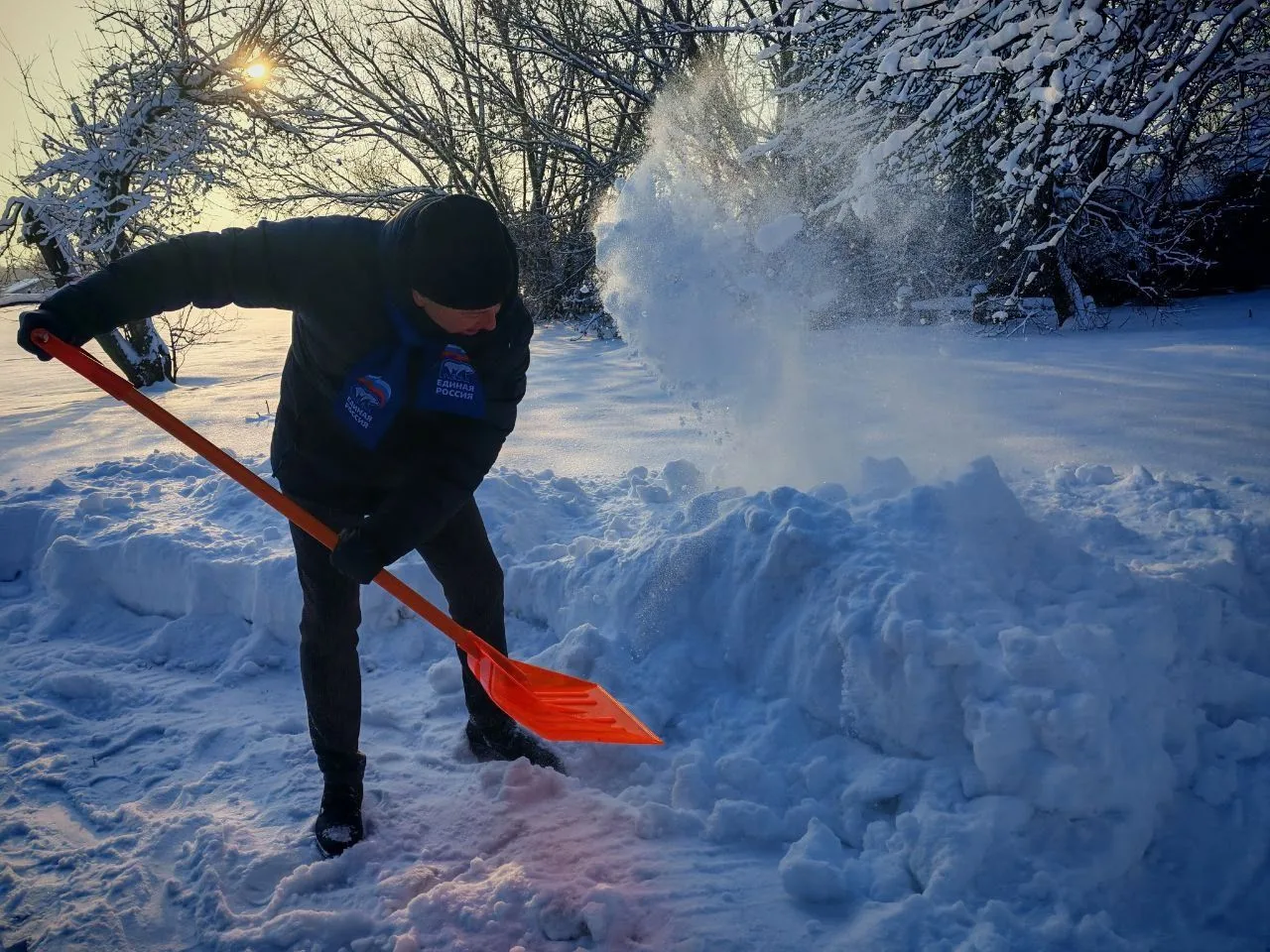 В Староюрьевском округе убирать снег волонтерам помогает секретарь местного отделения «Единой России», глава округа Виталий Кусов